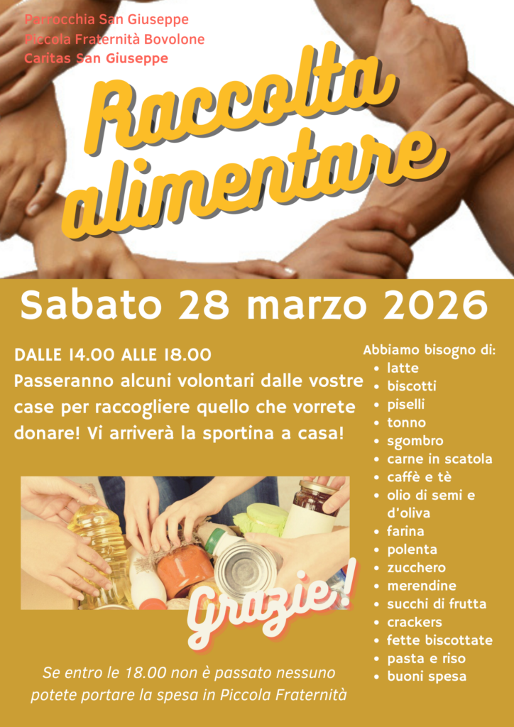 Sabato 28 marzo, dalle 14.00 alle 18.00 i nostri volontari passeranno per la tradizionale raccolta alimentare in favore della Piccola Fraternità. Se non ti è arrivata il saccettino puoi usare un tuo sacchetto della spesa.